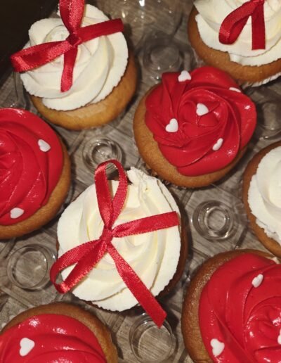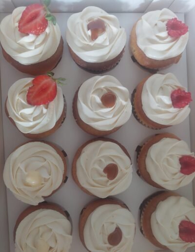 Composés d’une base fondante (vanille, chocolat, citron…) et surmontés d’un pochage aérien (crème au beurre allégée, ganache montée, mascarpone), ils cachent souvent un cœur coulant fruité ou praliné. Entièrement personnalisables, ils s’habillent de vos couleurs, de fleurs comestibles ou de petits décors en pâte à sucre pour s’accorder parfaitement au thème de votre événement.